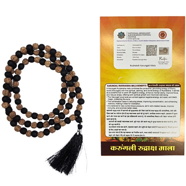 The Karungali Rudraksha Mala is a sacred spiritual accessory that beautifully combines the divine power of Rudraksha beads with the protective qualities of Karungali wood. This mala is widely valued in spiritual traditions for its ability to promote inner peace, protection, and positive energy in everyday life. Designed for devotees, spiritual seekers, and meditation practitioners, this mala can be used for japa (chanting), meditation, prayer, or daily spiritual wear.